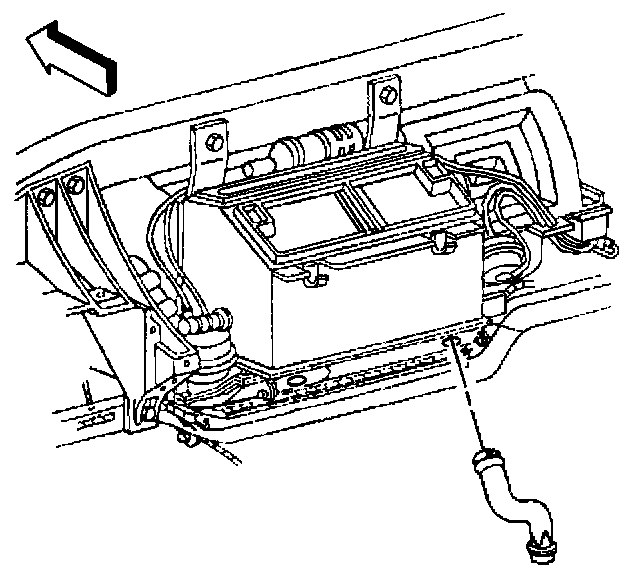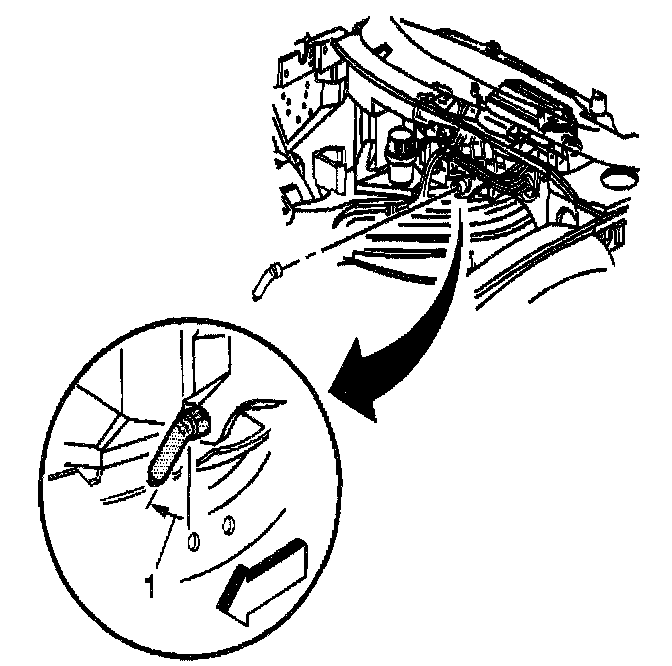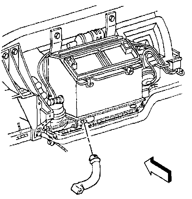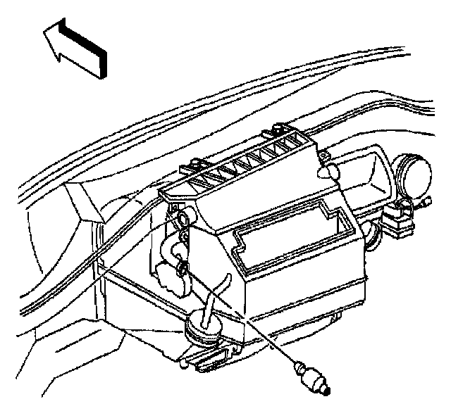 37. Install the evaporator and HVAC module drain tube to the module; orientate the drain tube to contact the dash panel as shown (1).