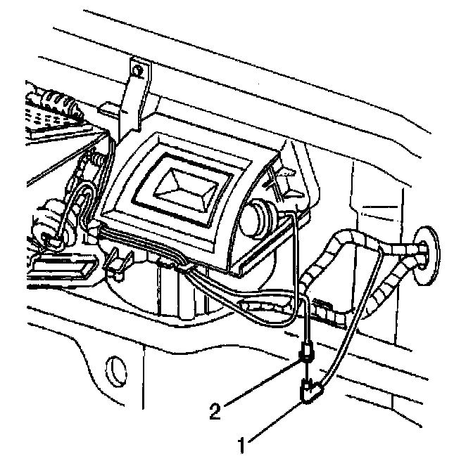 6. Connect the I/P harness vacuum source line (1) to the HVAC module vacuum harness (2).
