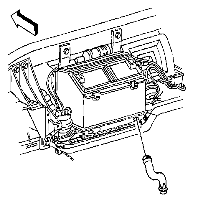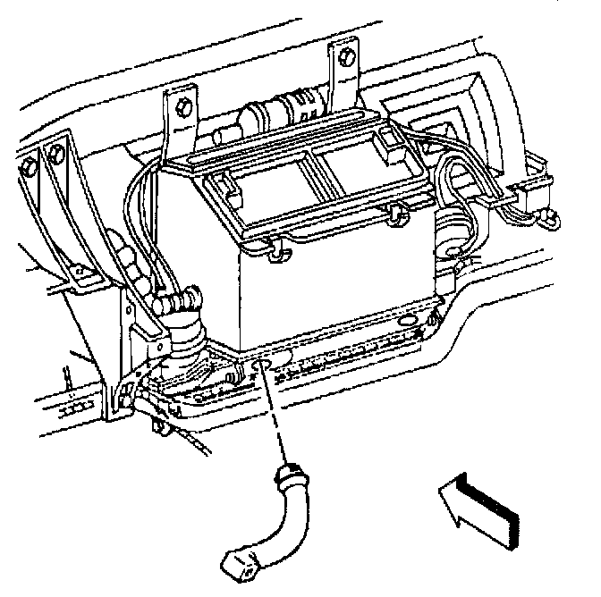 32. Install the evaporator and HVAC module drain tube to the module; orientate the drain tube to contact the dash panel as shown (1).