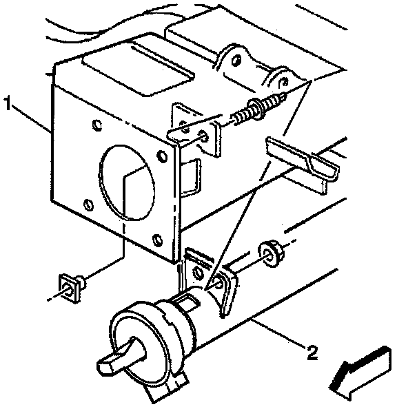 12. Remove the steering column (2) from the vehicle. Rotate the steering column clockwise as the bottom of the steering column reaches the reinforcement assembly. This will allow the Steering Wheel Position sensor room to clear the instrument panel brace.