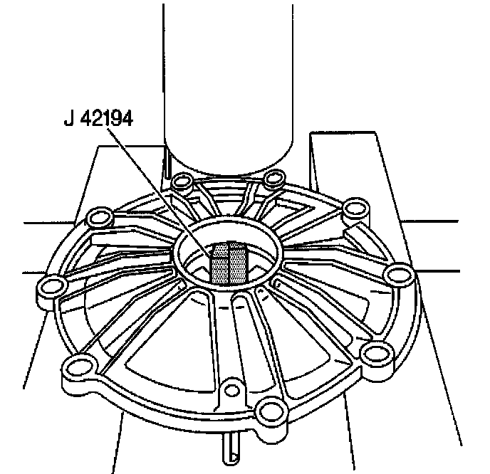 7. Remove the left side differential case bearing outer race from the differential carrier using the J 42194 and a hydraulic press.