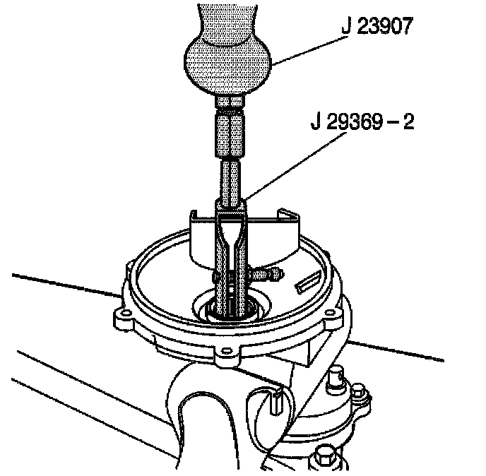 5. Remove the output shaft bearing from the left carrier cover using the J 42156 and the J 23907.