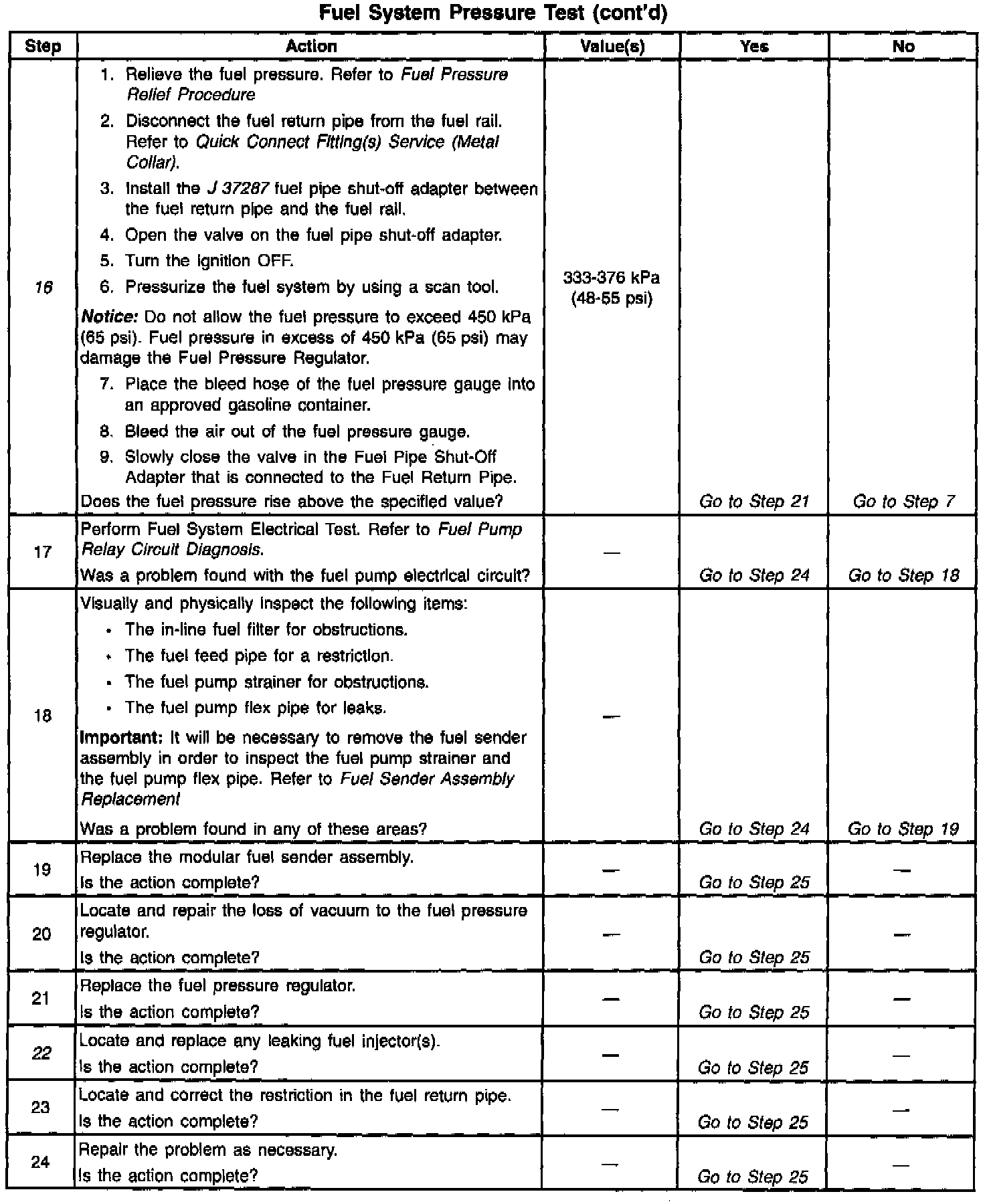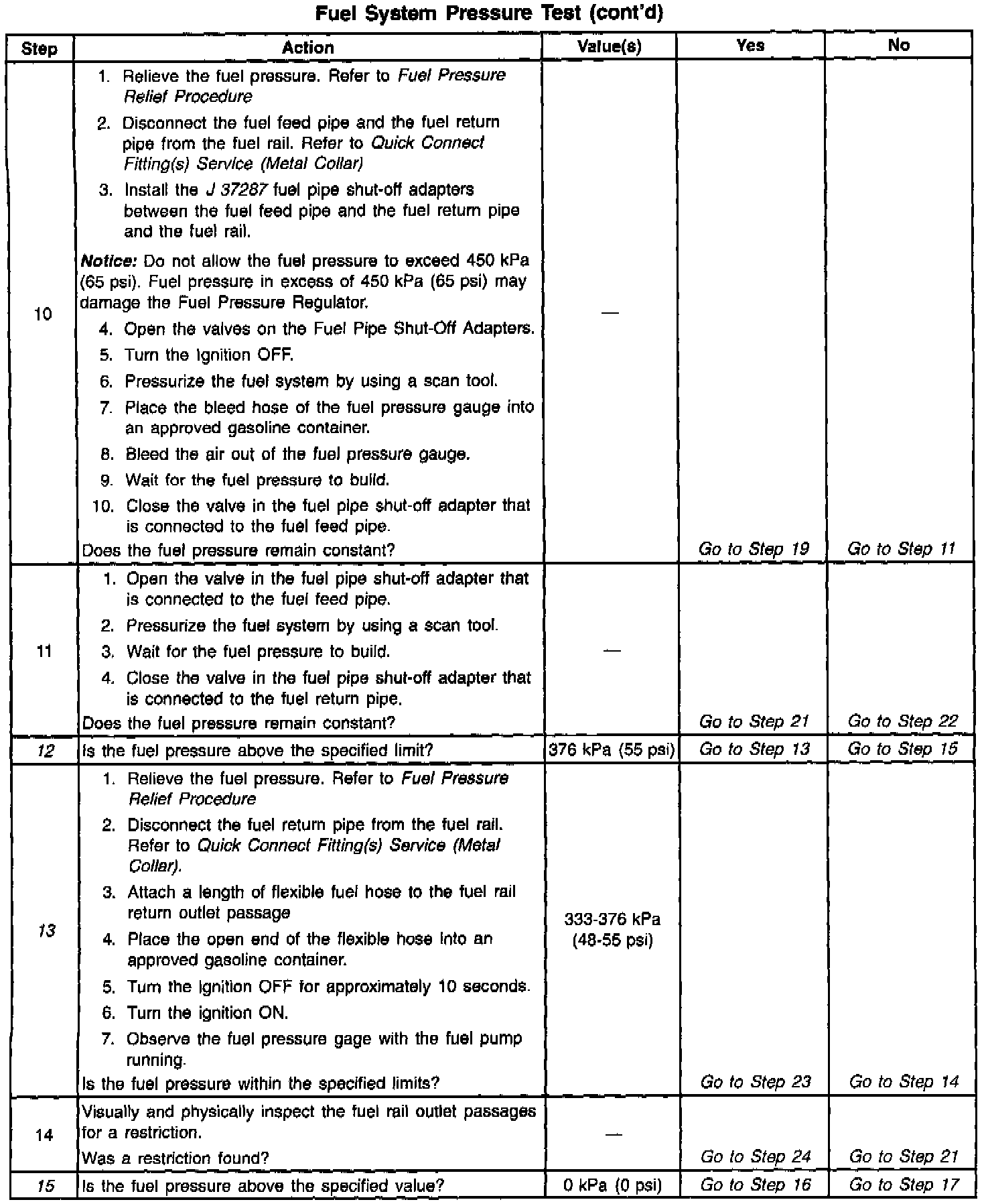 16. Restricting the fuel return pipe with the Fuel Pipe Shut-Off Adapter J 37287 causes the fuel pressure to rise above the regulated fuel pressure. Using a scan tool to pressurize the system, the fuel pressure should rise above 376 kPa (55 psi) as the valve on the Fuel Pipe Shut-Off Adapter connected to the fuel return pipe becomes partially closed.