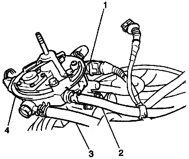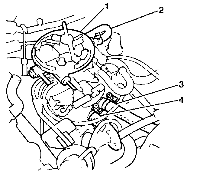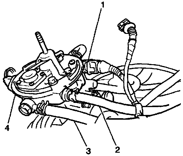 7 Install the fuel return (2) and the fuel feed (3) hoses to the TBI unit (4).
