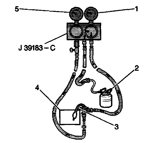 3. Connect the expansion valve (3) to a J 39183-C. Connect the gauge set charging hose to a Refrigerant-134a refrigerant drum (2).