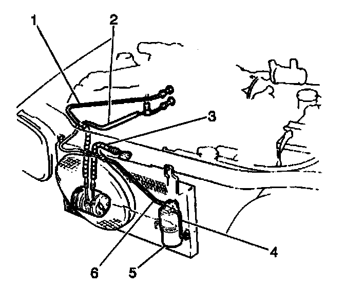 2. Remove the 2 bolts and the receiver/dryer inlet and outlet fittings on top of the receiver/dryer (5).