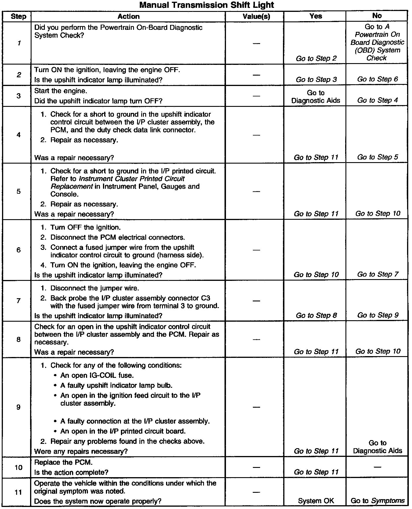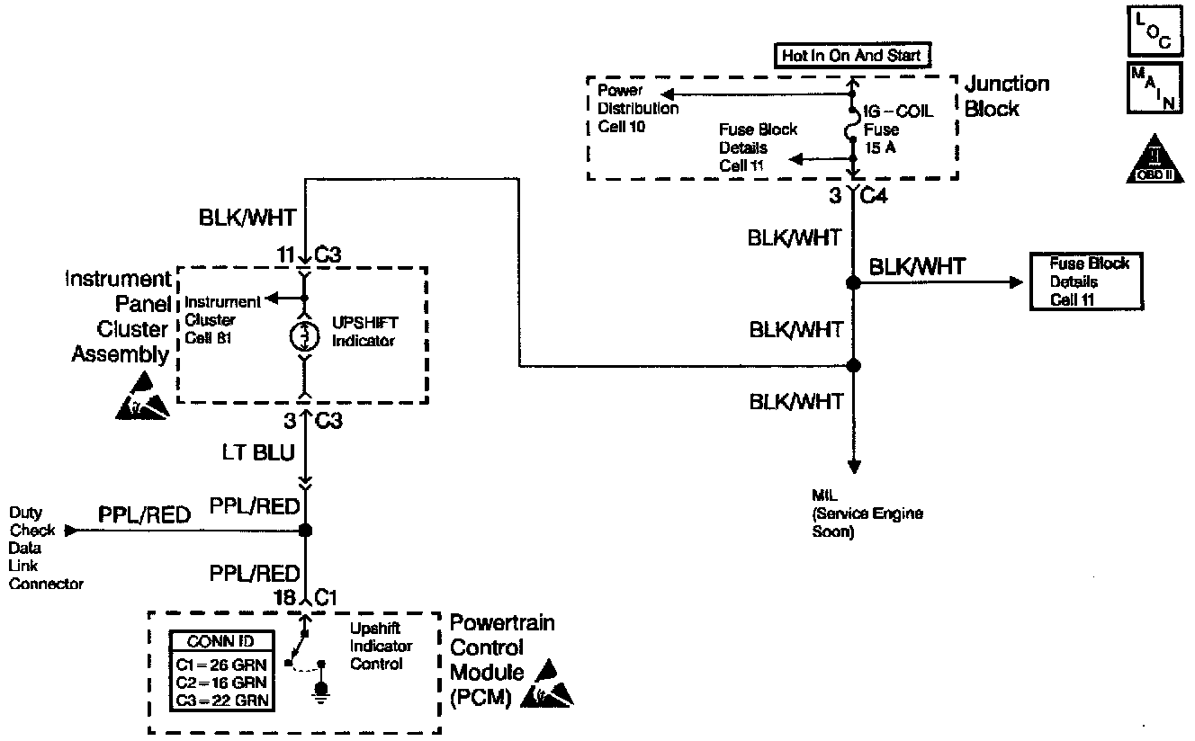 The upshift indicator lamp is controlled by the powertrain control module (PCM). The upshift indicator lamp is illuminated when the upshift indicator control circuit from the I/P cluster assembly is grounded by the PCM. The upshift indicator lamp will be illuminated all the time if the lamp control circuit is shorted to ground. The lamp will not illuminate when commanded by the PCM if the upshift indicator lamp circuit is open.