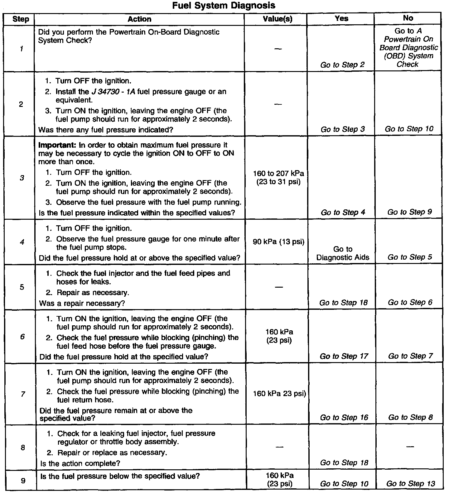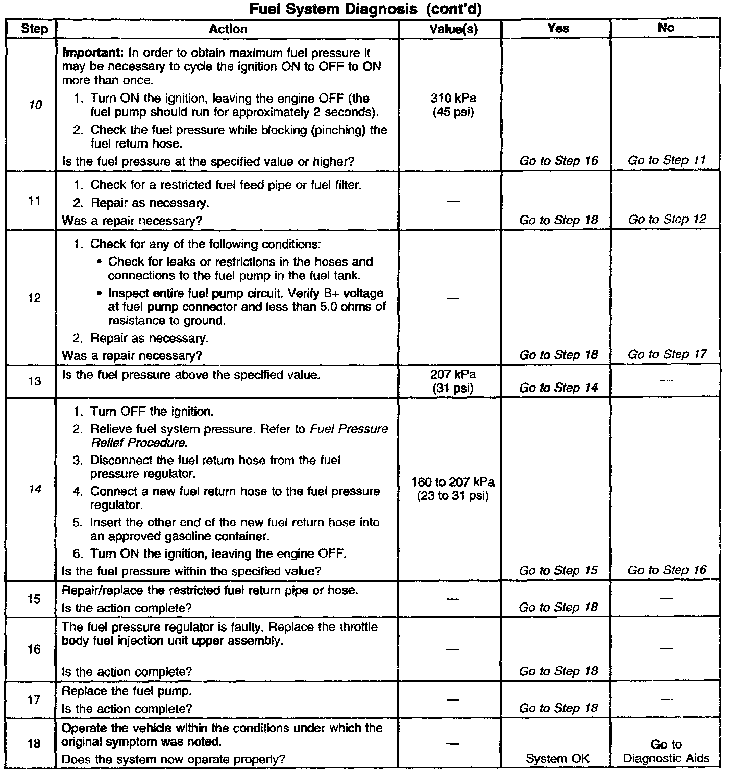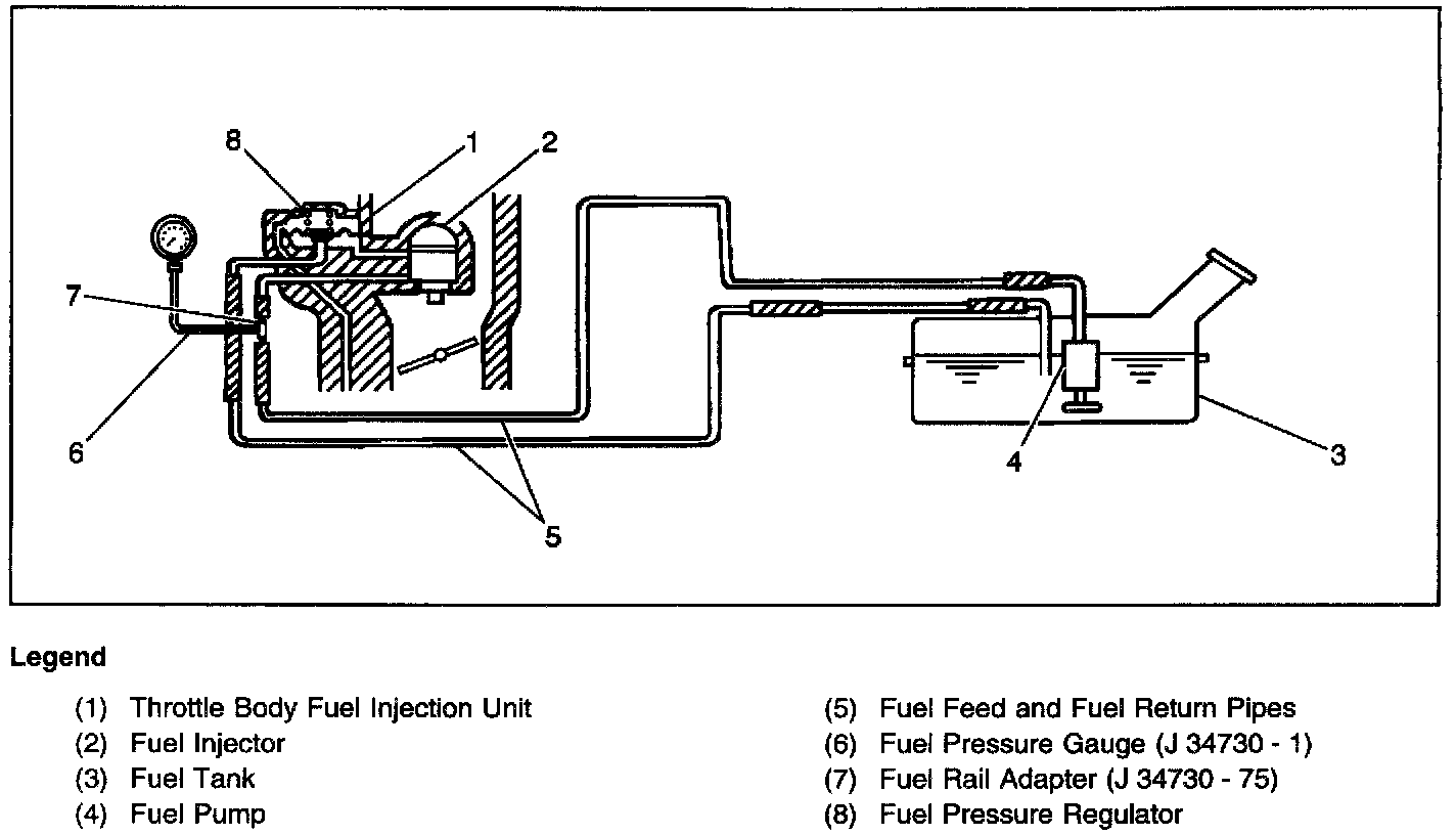 The fuel pump will deliver fuel to the fuel injector in the TBI unit at a controlled pressure. The controlled pressure is 160-210 kPa (23-31 psi) when the fuel pump is energized and the engine not running. The controlled pressure is 90-140 kPa (13-20 psi). when the engine is idling at normal operating temperatures. The fuel pressure regulator maintains the correct fuel pressure at all times by returning excess fuel to the fuel tank.