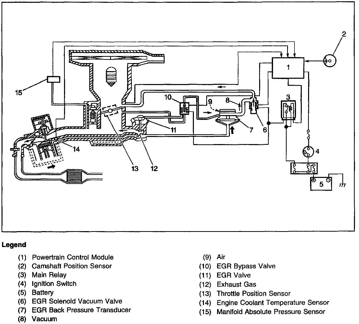 Operation of the EGR valve is controlled by the powertrain control module (PCM). The PCM uses the EGR solenoid vacuum valve in order to control the vacuum signal to the EGR back pressure transducer. The EGR back pressure transducer regulates the vacuum signal to the EGR valve. The EGR valve opening is controlled by the vacuum signal. The EGR solenoid vacuum valve is turned ON when the PCM senses various inputs from the engine information sensors.