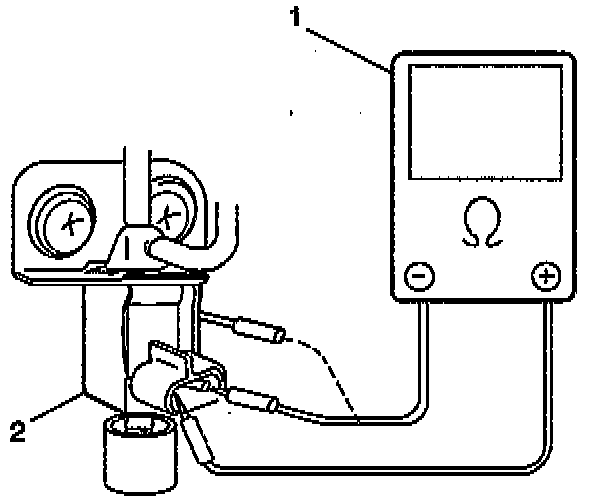 ^ Measure the resistance (1) of the EGR solenoid vacuum valve terminals (valve side). The resistance should be 33-39 ohms at 20°C (68°F).