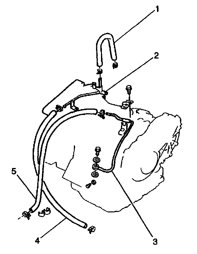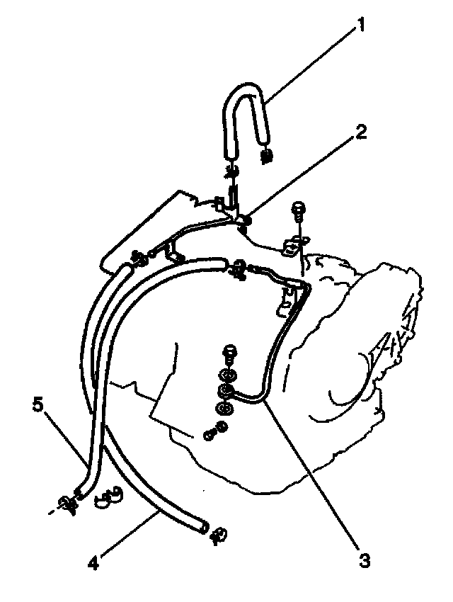 5. Install the fluid cooler hoses (1,4,5) to the transaxle cooler at the bottom of the radiator. Secure with the inlet and the outlet hose-to-transaxle cooler clamps.