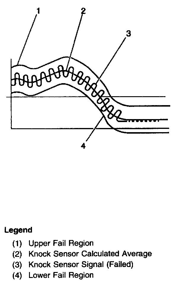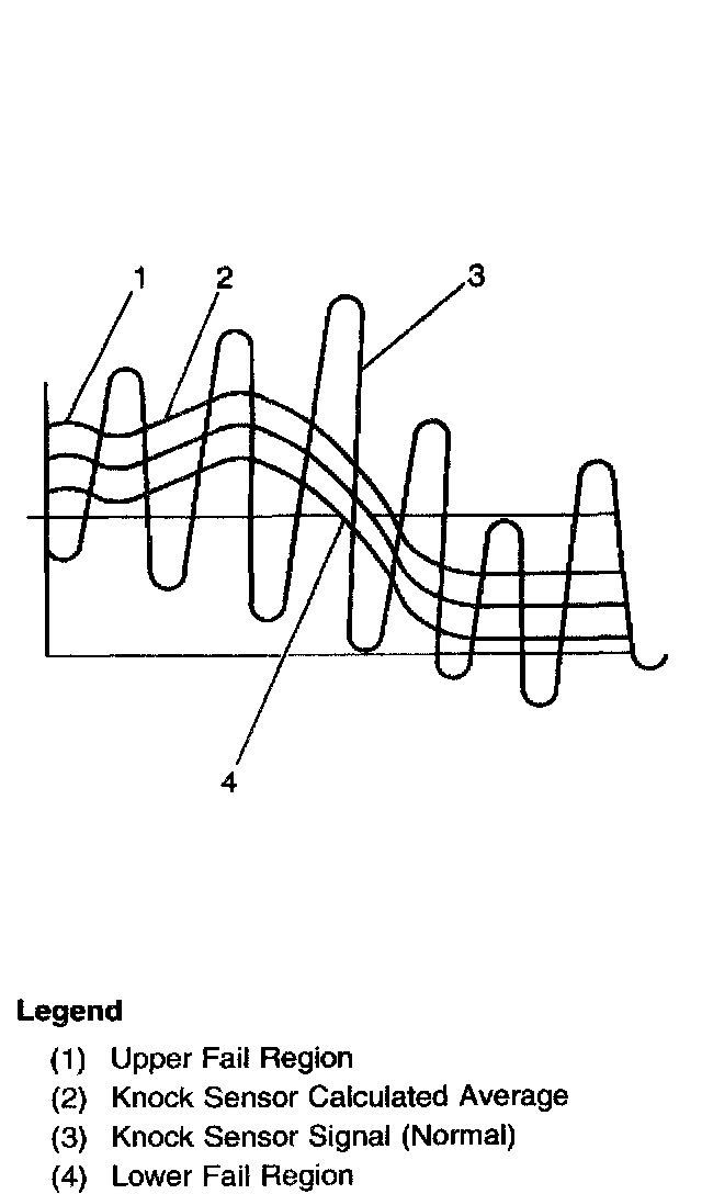 The PCM contains integrated Knock Sensor (KS) Diagnostic Circuitry. Input signals from the knock sensors are used to detect engine detonation, allowing the PCM to retard Ignition Control (IC) spark timing based on the amplitude and frequency of the KS signal being received. The knock sensors produce an AC signal under all engine operating conditions. The PCM calculates an average voltage of each knock sensor's signal and takes instantaneous signal voltage readings. The PCM uses the instantaneous signal voltage readings to determine the state of the knock sensor circuitry. If the knock sensor system is operating normally, the PCM should monitor instantaneous KS signal voltage readings varying outside a voltage range above and below the calculated average voltage(as shown in the normal knock sensor figure). If the PCM detects a knock sensor signal voltage within the calculated average voltage range, DTC P0327 or P0332 will set (as shown in the abnormal knock sensor figure).