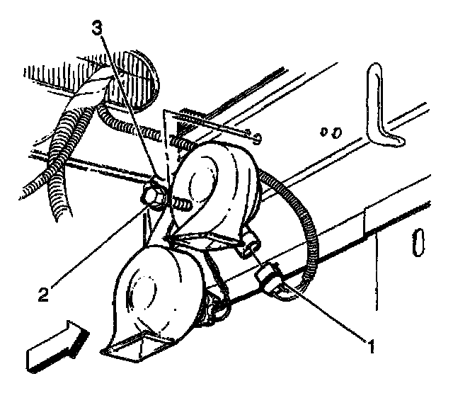 2. Install the horn (3) to the right engine compartment side outer rail.