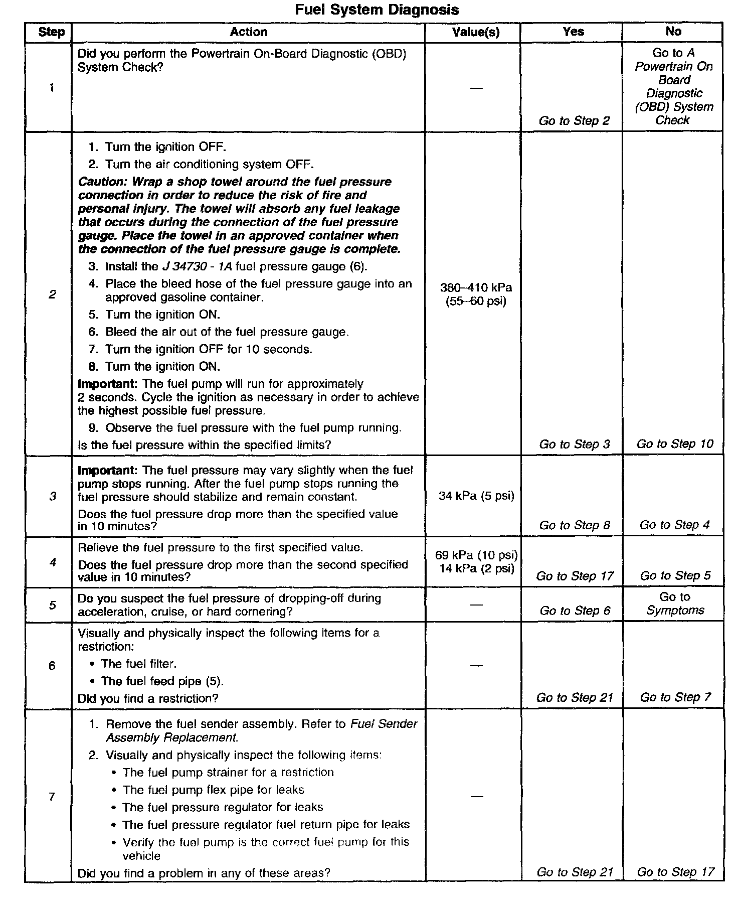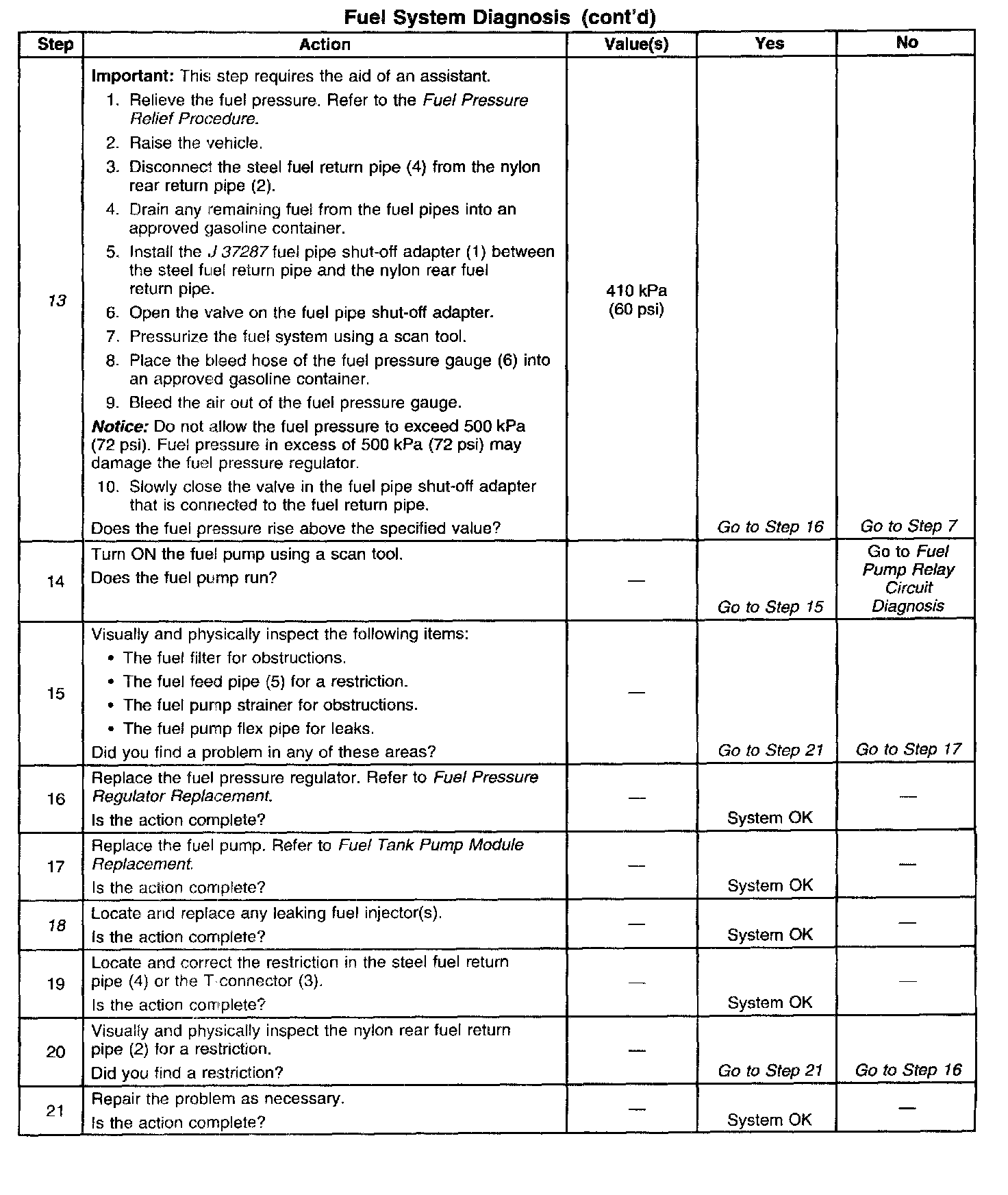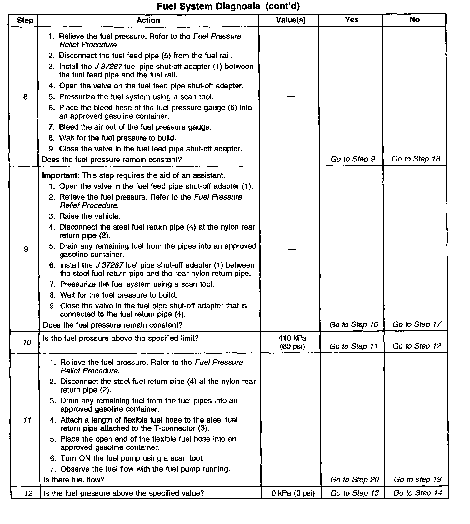 4. A fuel system that drops more than 14 kPa (2 psi) in 10 minutes after being relieved to 69 kPa (10 psi) indicates a leaking fuel pump check valve.