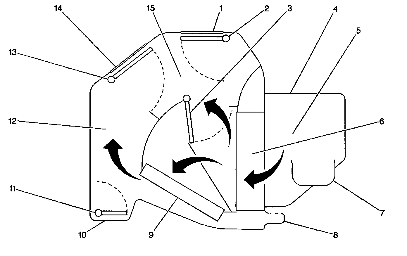3. The air is directed to one of the following outlets, depending upon the position of the defrost and heat valves:
