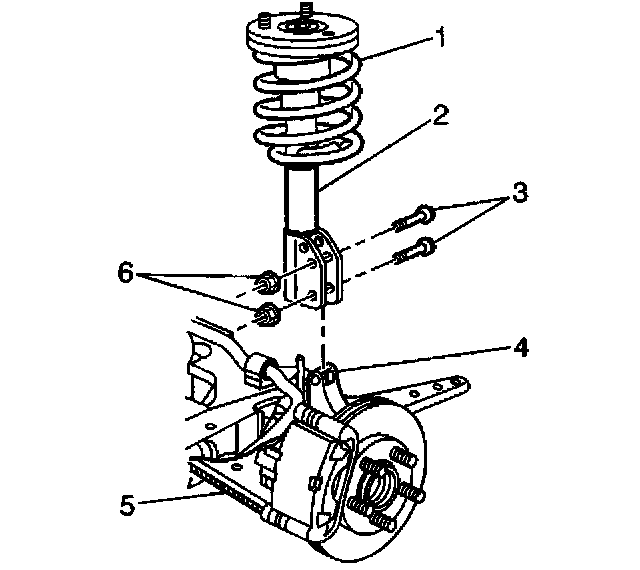 5. Remove the bolts (3) and nuts (6) that attach the steering knuckle (4) to the strut (2).