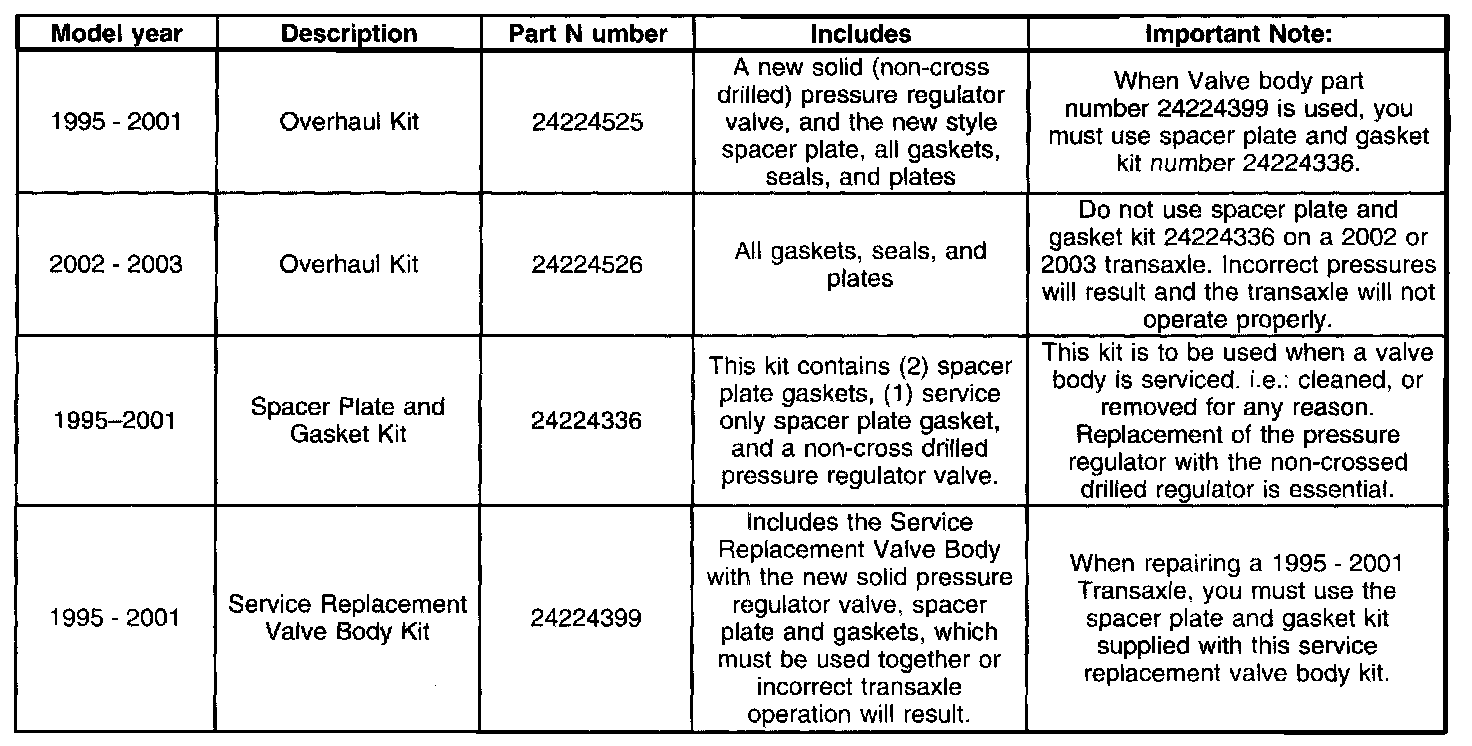 When servicing a 1995 through 2001 4T40E/4T45E transaxle, the pressure regulator valve # 328 must be changed (it is included in the overhaul kit, P/N 24224525). Also included in this overhaul kit is the new spacer plate and gaskets required when the pressure regulator valve is replaced in the valve body.