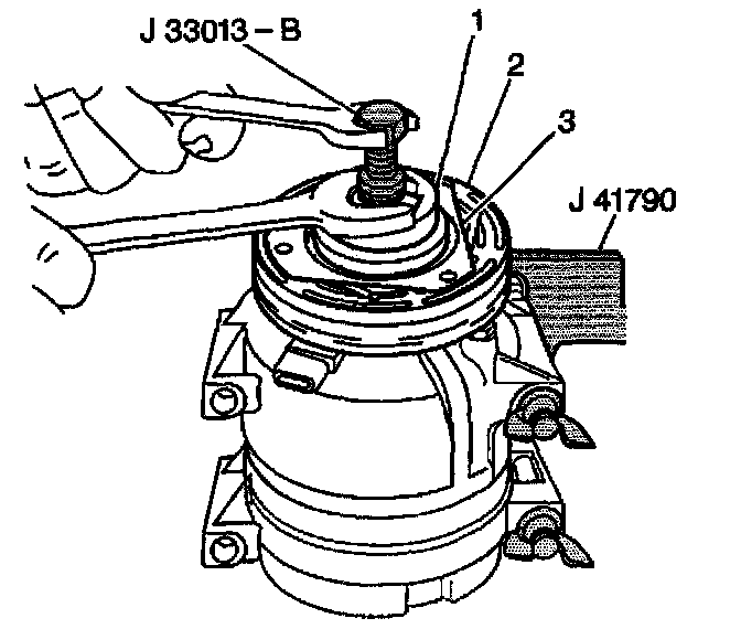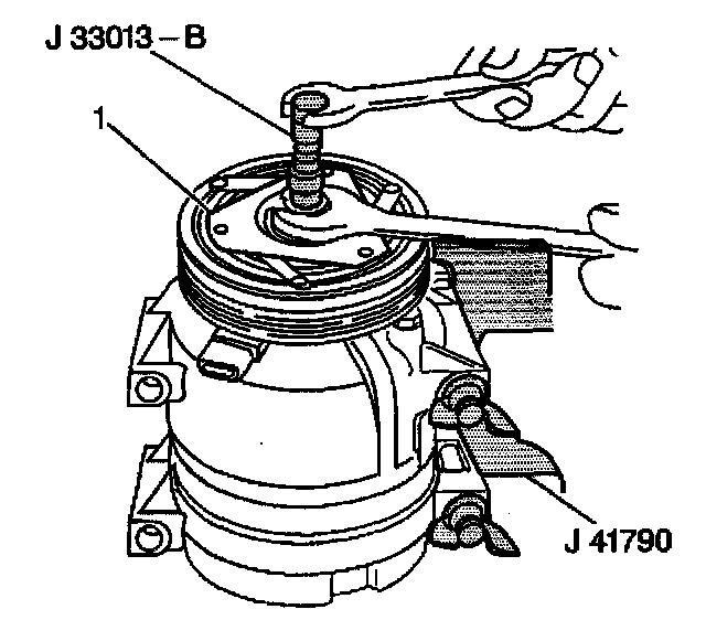 6. Remove the hub and drive plate assembly (1) by turning the center screw into the body of the J 33013-B and against the compressor shaft.