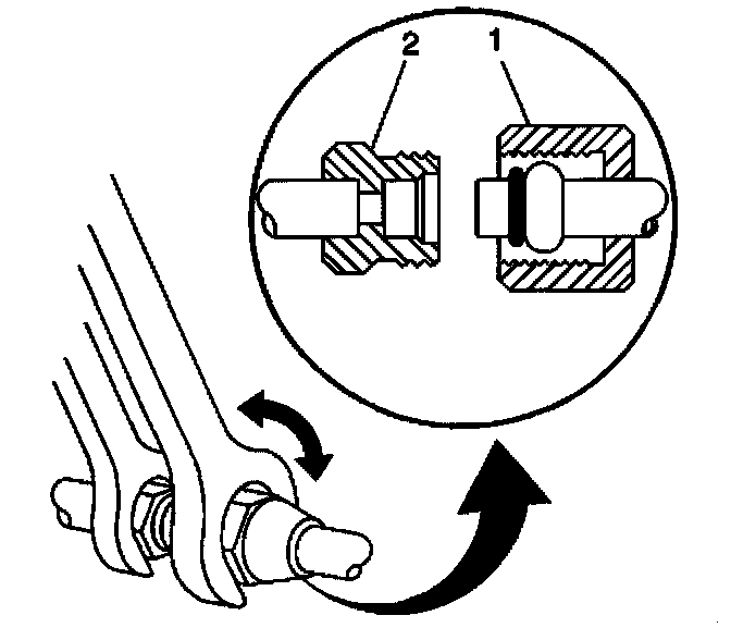 4. Using a back-up wrench on the condenser fitting (2), loosen the compressor hose fitting (1) from the condenser.