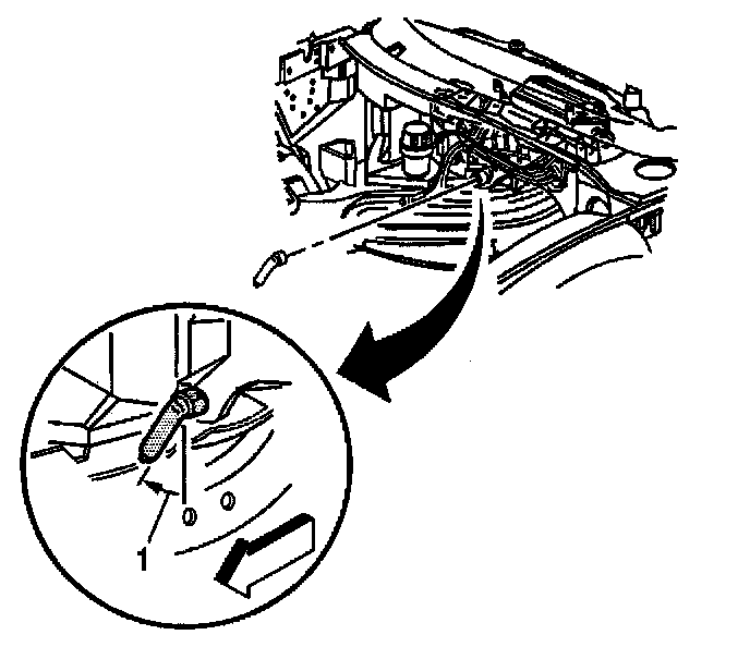37. Install the evaporator and HVAC module drain tube to the module; orientate the drain tube to contact the dash panel as shown (1).