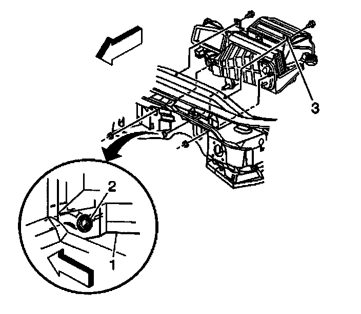 2.1. Check the dashmat (1) for proper alignment to the dash panel; align if necessary. The opening in the dashmat for the HVAC module drain should be aligned so that the drain opening in the dash panel is approximately centered in the dash mat opening; allowing ample room for the module drain seal (2) to fully seat against the dash panel.