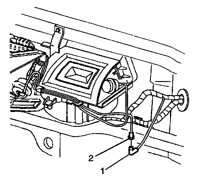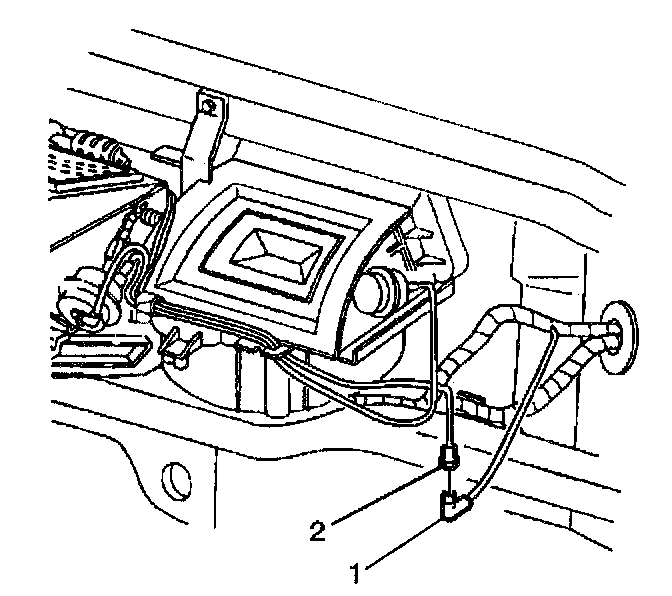 40. Disconnect the I/P harness vacuum source line (1) from the HVAC module vacuum harness (2).