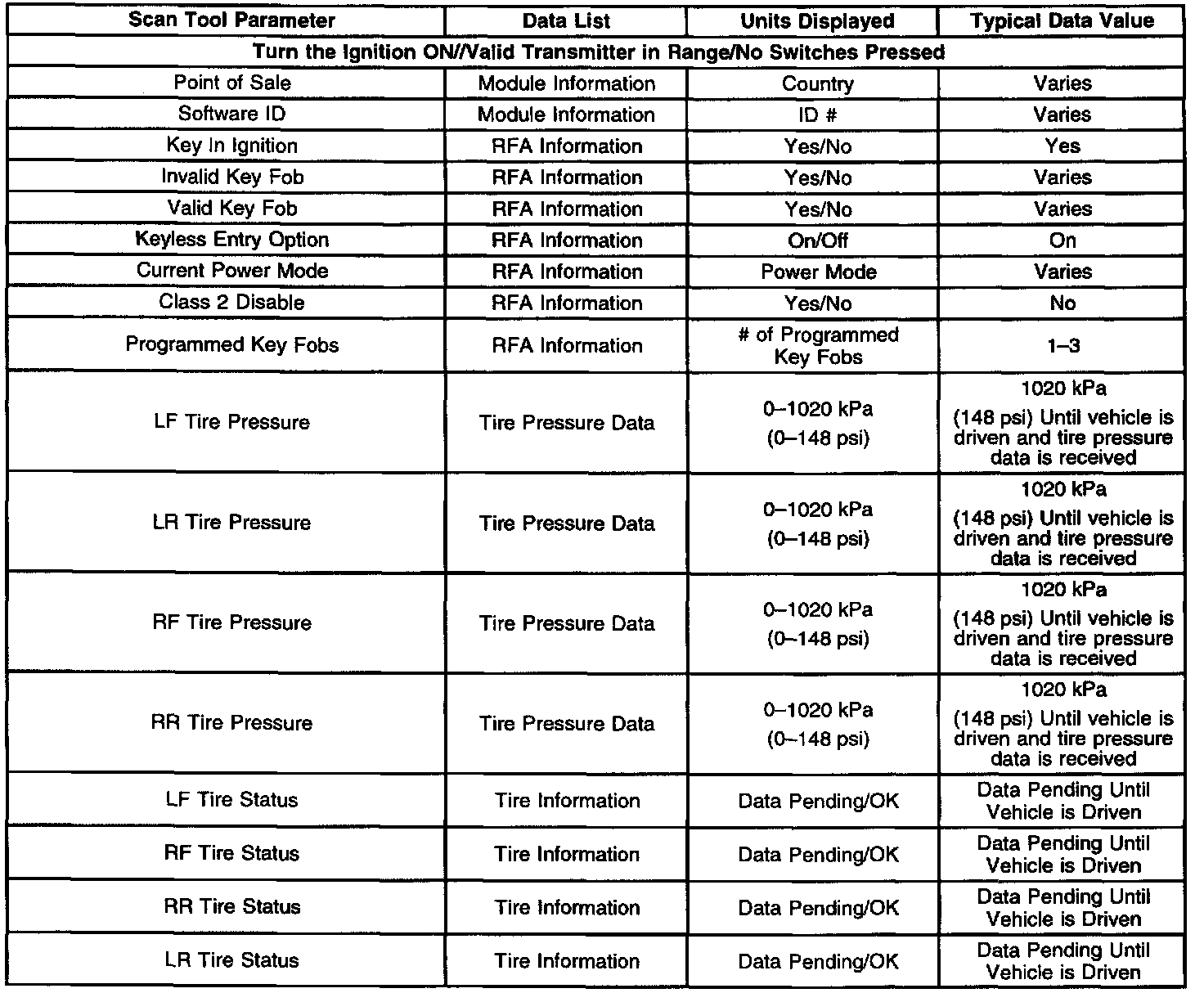 RF Tire Pressure:: The scan tool displays 0 - 1020 kPa (0 - 148 psi). The scan tool displays tire pressure data received from the RF tire pressure sensor. The scan tool will display 1020 kPa (148 psi) until the vehicle is driven and RF tire pressure sensor information is received.
