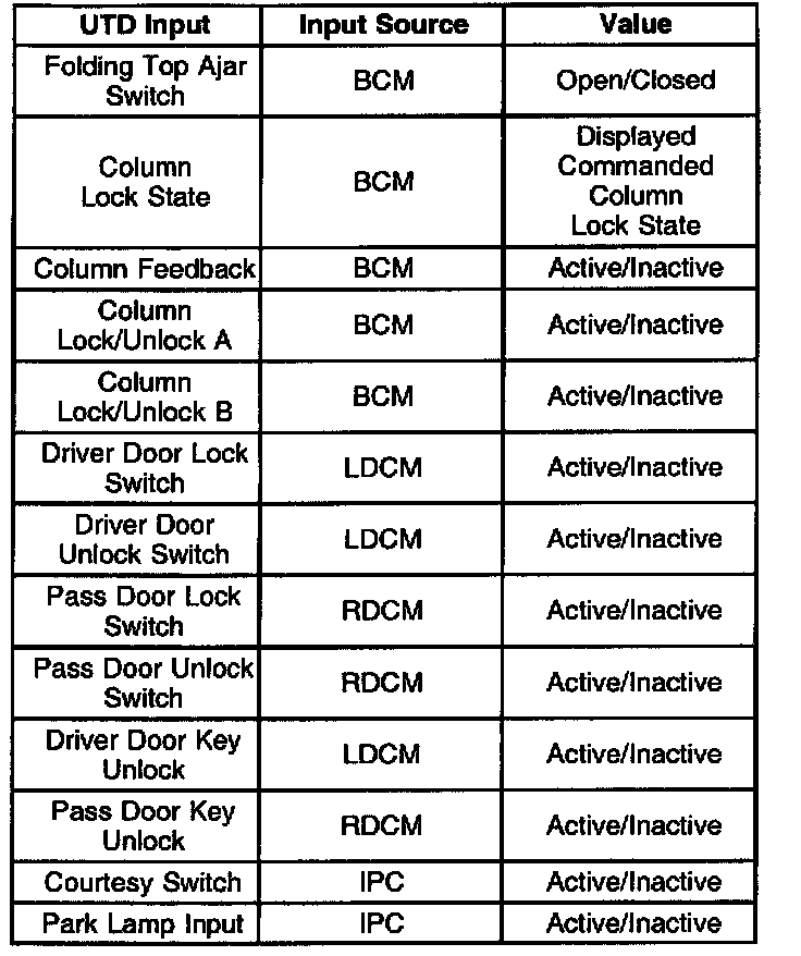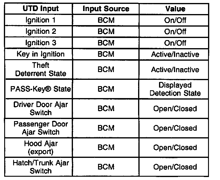 The scan tool displays UTD input status. Select the appropriate system's input status display in order to display the data and determine if the switched inputs can be properly interpreted. The display also indicates if the input has changed states. For example, when a door is closed, the scan tool displays the input status of the door ajar switch as INACTIVE. When the door is open, the scan tool reads ACTIVE. Use this kind of information when diagnosing a malfunction associated with a particular UTD input or an input that is shared with another system. The following table describes where to access scan tool input information that affects UTD operation.