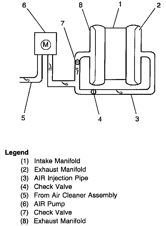 The AIR pump with integral stop valve is controlled by the PCM. The PCM will turn ON the AIR pump by providing the ground to complete the circuit which energizes the AIR pump relay. When air to the exhaust ports is desired, the PCM will turn ON the integral stop valve and then the AIR pump.