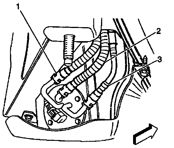 13. Connect the fuel sender fuel feed pipe (1) (jet pump to left tank), the fuel return rear pipe (2), and the fuel feed rear pipe (3).