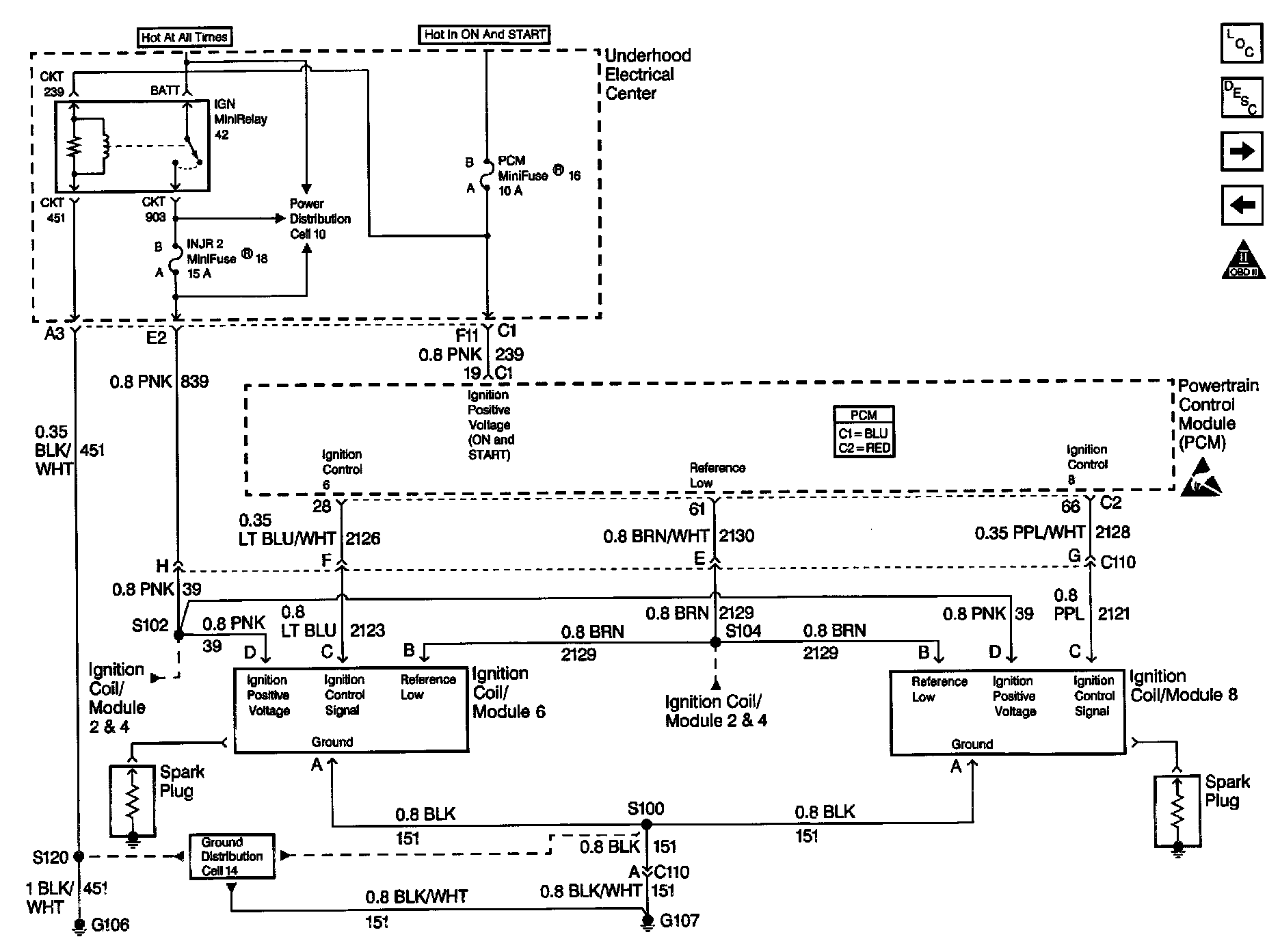The ignition system on this engine uses an individual ignition coil/module for each cylinder. The PCM controls the ignition system operation. There are eight Ignition Control (IC) circuits, one per cylinder, that connect the PCM with the ignition coil/modules. Each ignition coil/module has a power feed, a chassis ground circuit, a signal circuit and a reference low circuit. The PCM calculates the ignition sequence and timing of the spark plugs.