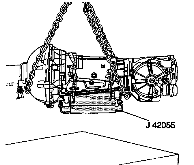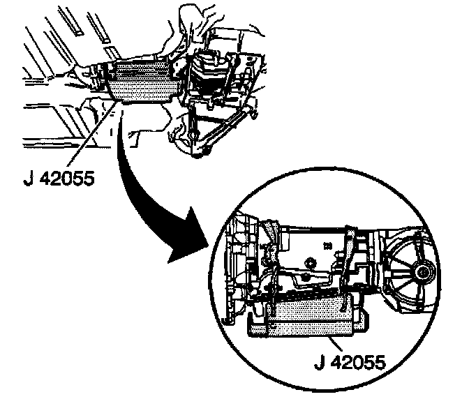 43. Release the J 42055 from the transmission, then remove the J 42055 and transmission jack.