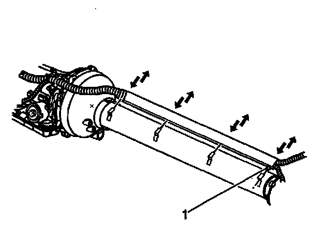 38. Release the retainer (1) securing (and positioning) the wiring harness to the L-shaped brackets along the driveline support assembly, then slide the harness up out of the brackets and position out of the way.