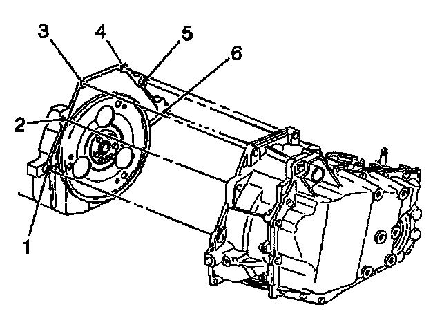 - Tighten the lower transaxle-to-engine bolt (6) and stud (1) to 75 Nm (55 ft. lbs.).