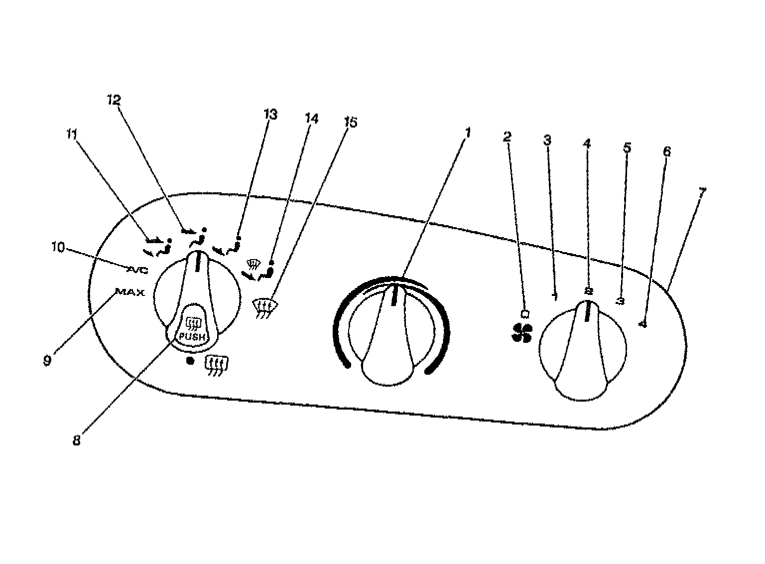 The knobs on the control head (7) control the operation of the A/C system. The compressor clutch and the blower connect electrically to the control head by a wiring harness. Off (2) is on the blower switch. Cooled and dehumidified air is available in the Max (9), A/C (10), Bi-level (11), Defog (8) and Defrost (15) modes.