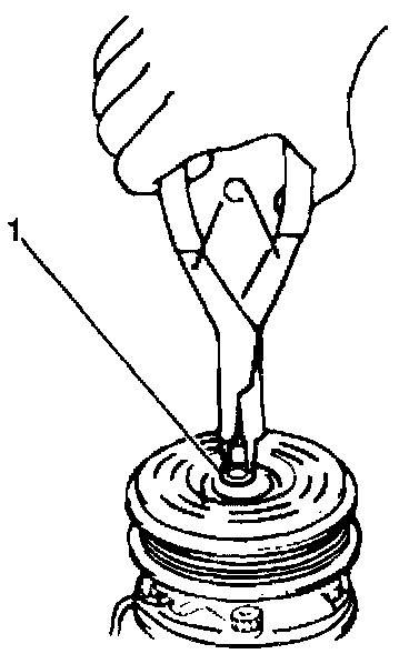 3. Install the clutch pulley to the compressor. Secure the clutch pulley with the snap ring (1) and the shim.
