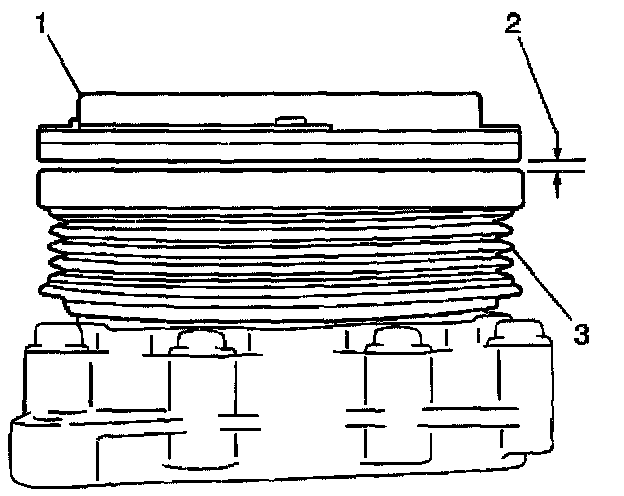 5. Adjust the clearance (2) between the clutch pulley (3) and the pressure plate. Replace the shim in order to obtain the proper clearance.