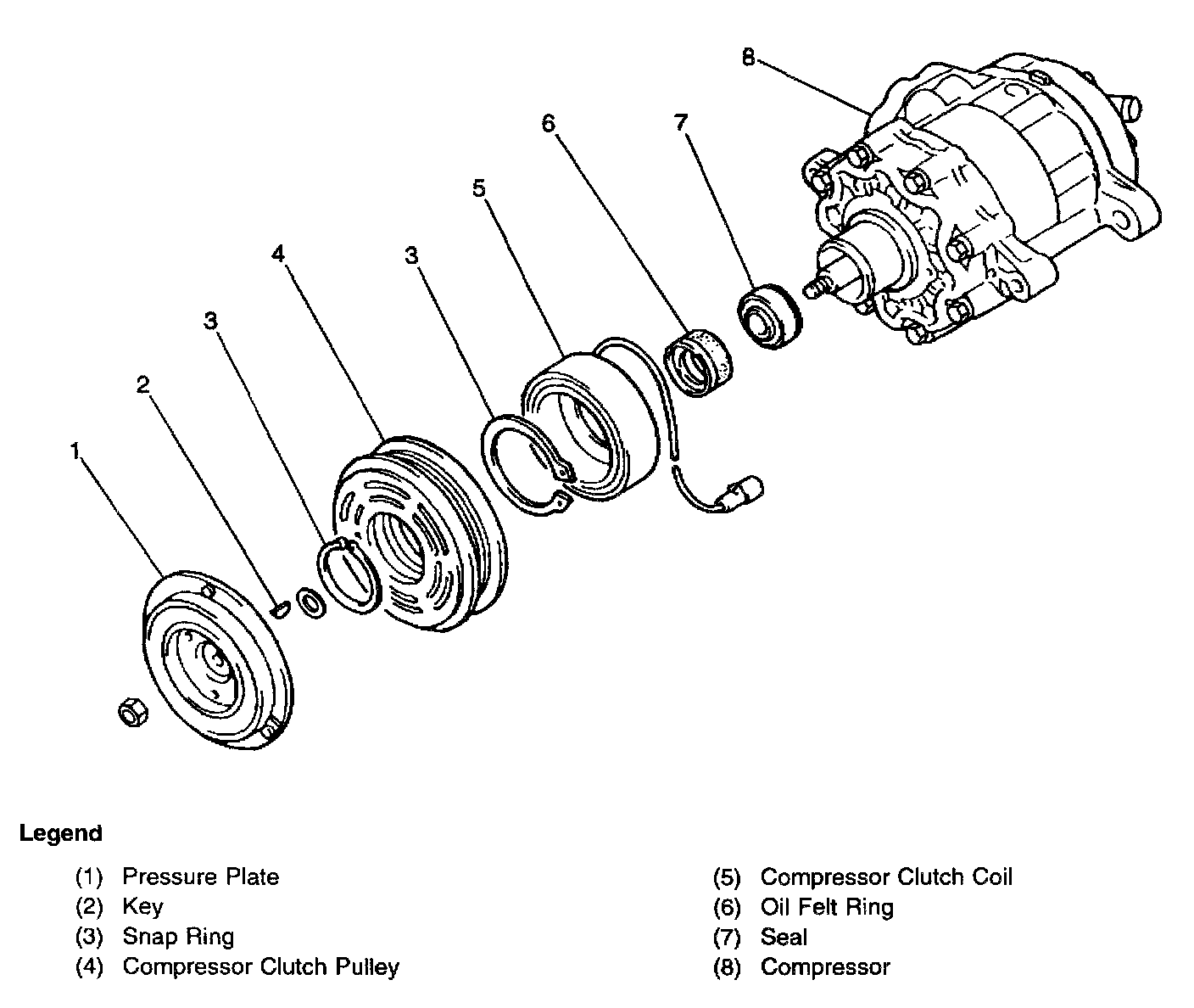 The compressor pulley rotates freely, without turning the compressor drive shaft until an electromagnetic clutch coil is energized. When voltage is applied in order 0 energize the clutch coil, the pressure plate is drawn rearward toward the pulley. The magnetic field locks the pressure plate and the pulley together as 1 unit in order to rotate the compressor drive shaft. The A/C compressor performs 2 main functions: