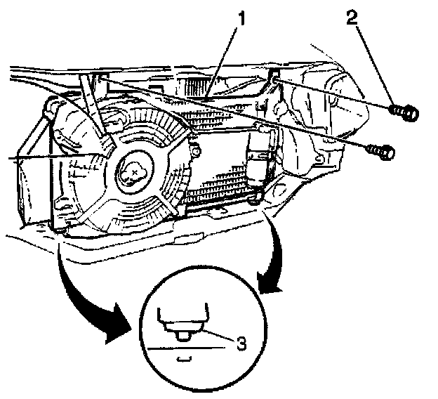 17. Remove the 2 bolts (2) and the 2 screws from the condenser tan (3).