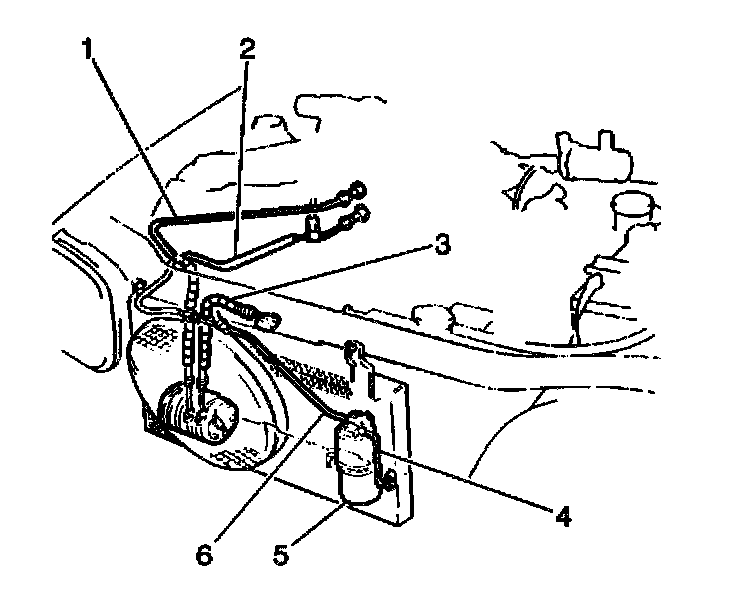 2. Remove the 2 bolts and the receiver/dryer inlet and outlet fittings on top of the receiver/dryer (5).