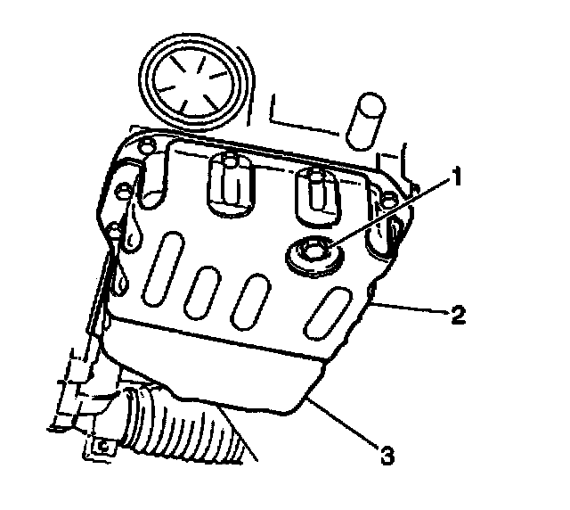 3. Remove the transaxle drain plug (1) from the transaxle fluid pan (3) and drain the transaxle fluid.