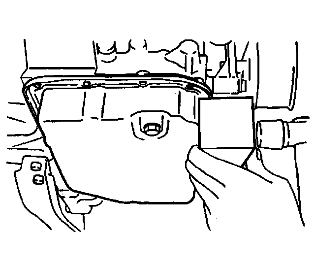 Notice: When removing the transaxle fluid pan, use caution in order not to damage the transaxle case-to-fluid pan mating surfaces. If the fluid pan is frozen to the transaxle case, use a rubber mallet and a wood block to lightly tap the fluid pan free. Do not attempt to pry the fluid pan away from the case with metal tools; damage to the case or fluid pan flange could result.