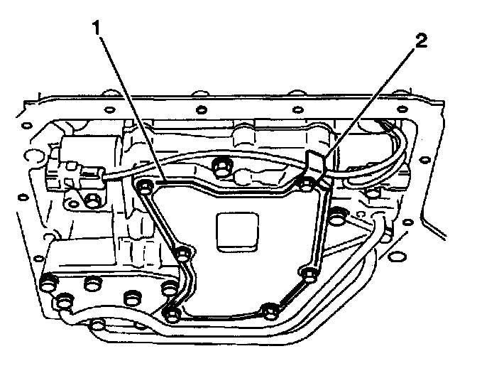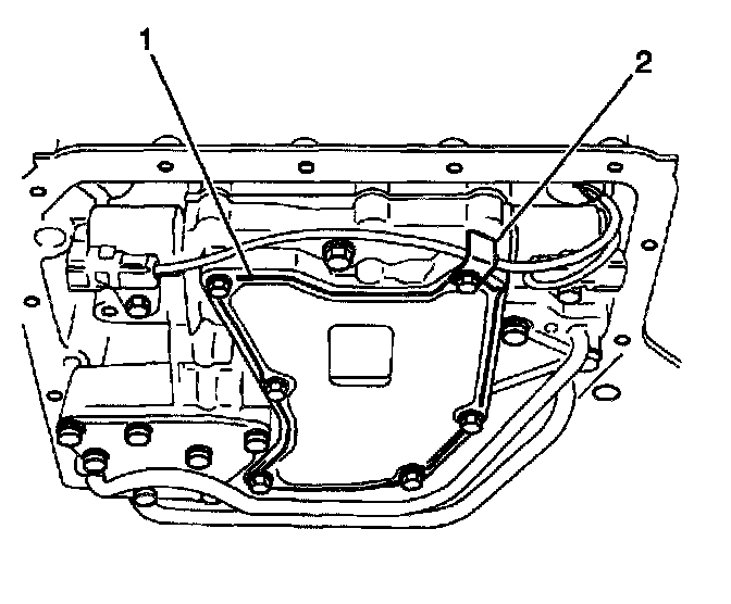 6. Remove 6 bolts and the fluid filter screen (1) from the valve body. Note the position of the solenoid wire clamp (2) for proper installation.