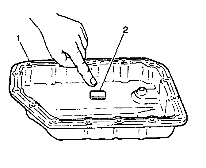 9. Clean the transaxle fluid pan magnet (2) and the bottom of the transaxle fluid pan (1).