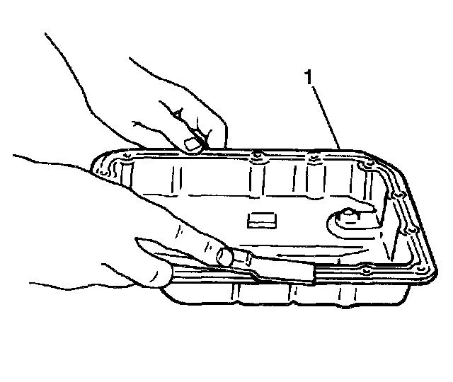10. Clean the gasket material from the fluid pan-to-case mating surfaces (1).