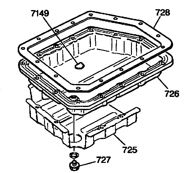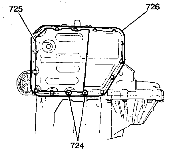 Important: The fluid pan contains 15 bolts in all. Two of them (724) have cross-recesses in their heads. Apply GM P/N 12346004, or the equivalent, to the threaded portion of these two bolts and install them in their proper positions. Do NOT apply the sealant to the remaining 13 bolts.