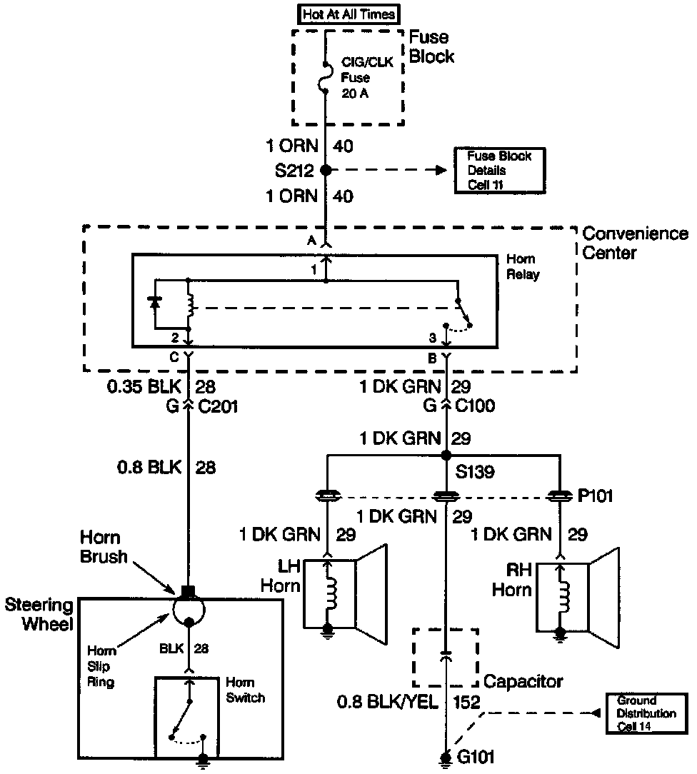 When diagnosing a horn problem use the service information located in the Horns service category. The following schematic is a typical example of a schematic with its supporting text.