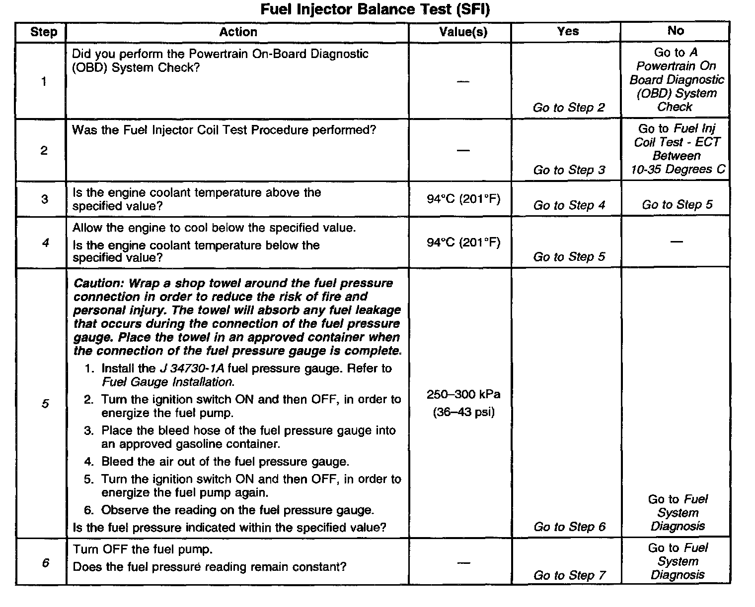 5. This step checks that the fuel pressure is within the specified range. If the fuel pressure is not within the specified range, refer to Fuel System Diagnosis. Component Tests and General Diagnostics