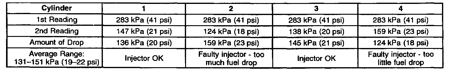 7. The fuel injectors are flowing properly if the pressure drop value for each fuel injector is within 10 kPa (1.5 psi) of the average pressure drop value. Calculate the pressure drop value for each fuel injector by subtracting the second pressure reading from the first pressure reading. Refer to the examples in the preceding table.