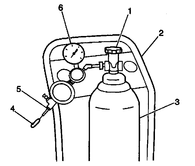 9. Disconnect the black hose (4) that connects to the pressure regulator valve (5) of the nitrogen cylinder (3) on the [1][2]EVAP cart.